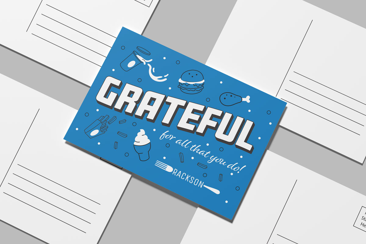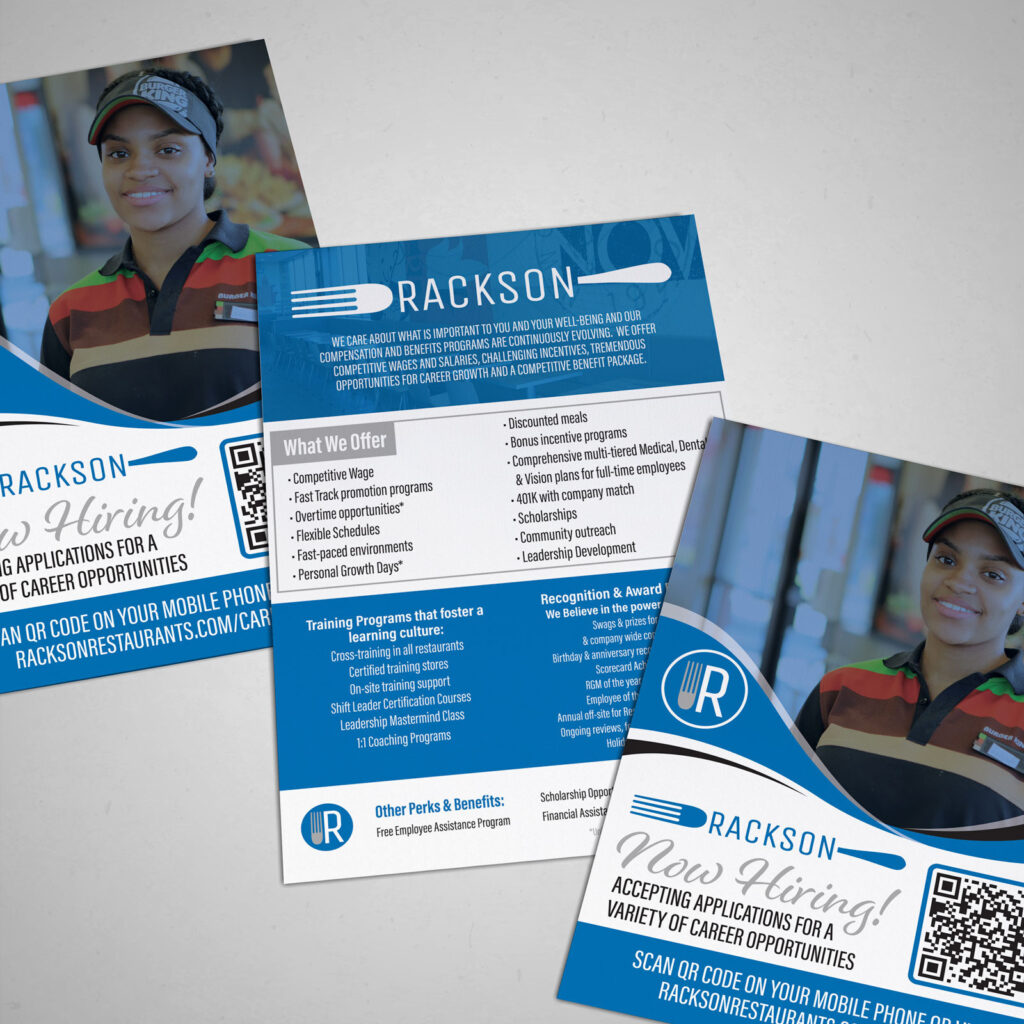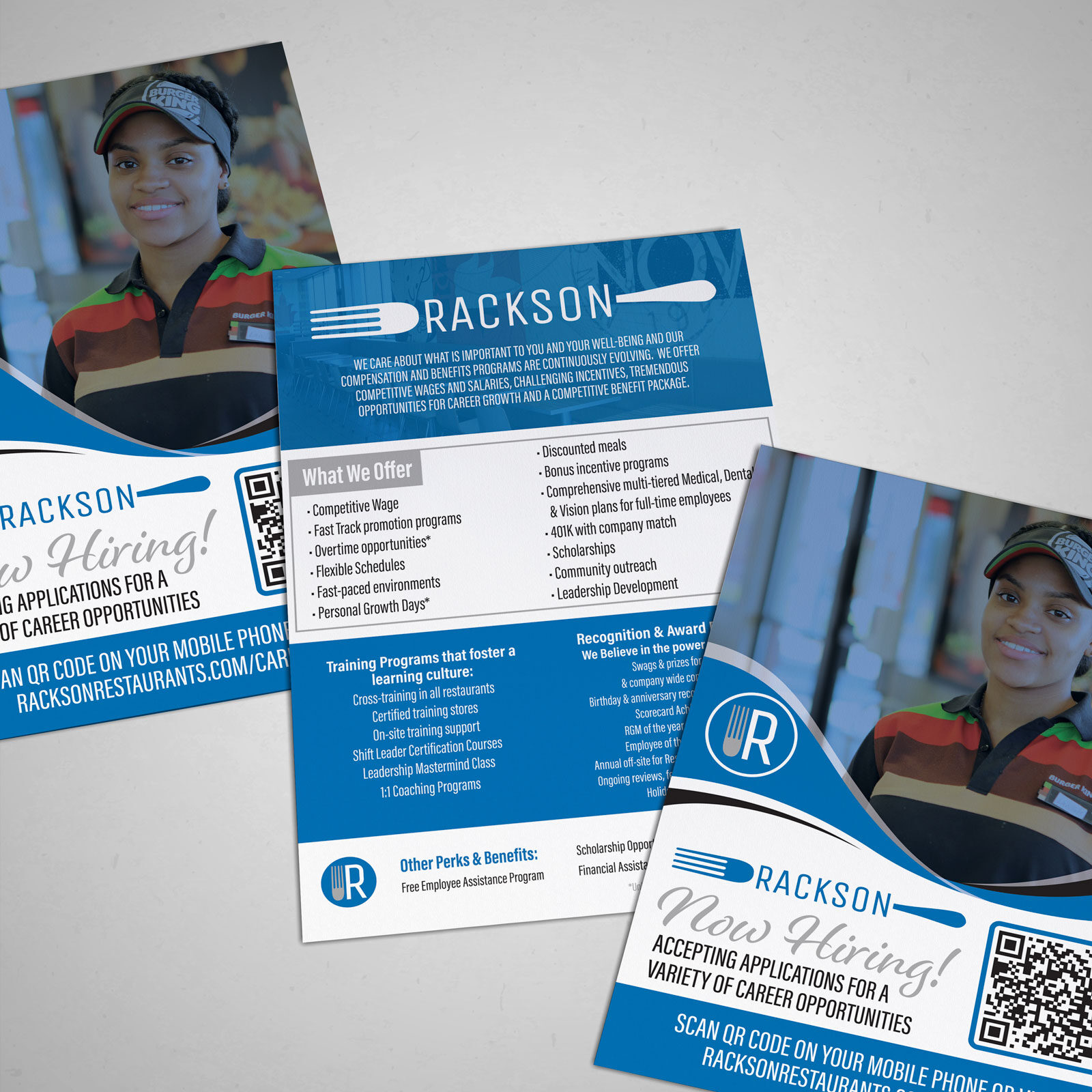 In addition to the website, I designed branded materials to support Rackson Restaurants’ employee engagement and recruitment efforts. For a hiring event, I created eye-catching flyers that clearly communicated the opportunity while reflecting the company’s culture. I also designed employee appreciation postcards featuring fun, playful imagery inspired by items from their fast-food chains, giving the materials a lively and approachable feel. These pieces reinforced the brand’s identity, celebrated their team, and helped foster a sense of connection and excitement among employees.