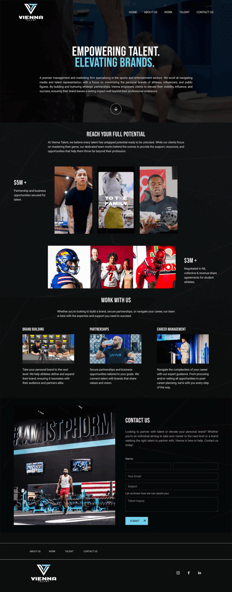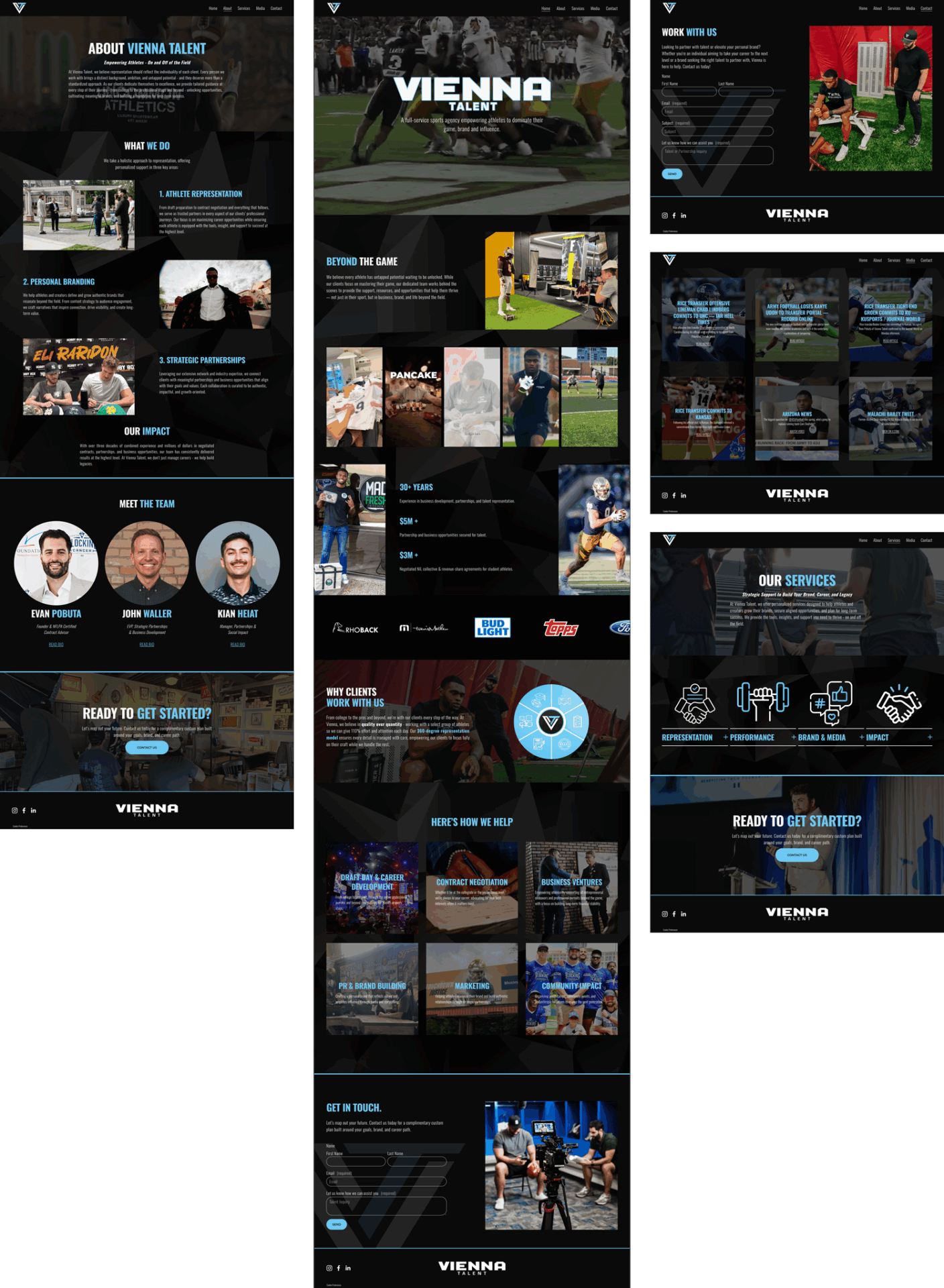 Vienna Talent Group is a full-service sports agency dedicated to empowering athletes to dominate their game, brand, and influence. They came to me seeking a website redesign that would elevate their digital presence with clear messaging and a strong brand identity. Their previous site didn’t fully communicate the agency’s expertise or the impact they create for their athletes, from contract negotiation to brand development. The goal was to build a modern, story-driven website that positioned Vienna Talent Group as confident yet approachable, emphasizing their authenticity, transparency, and results-driven approach.